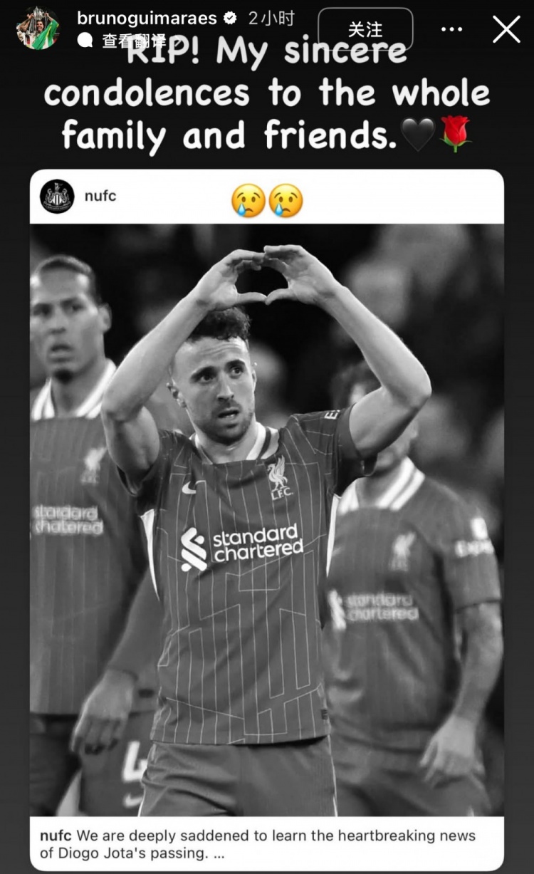 吉马良斯在社媒转发了纽卡俱乐部向若塔致哀的截图,并配文写道:“愿你安息!谨向若塔的家人和朋友送上关心和哀思。”