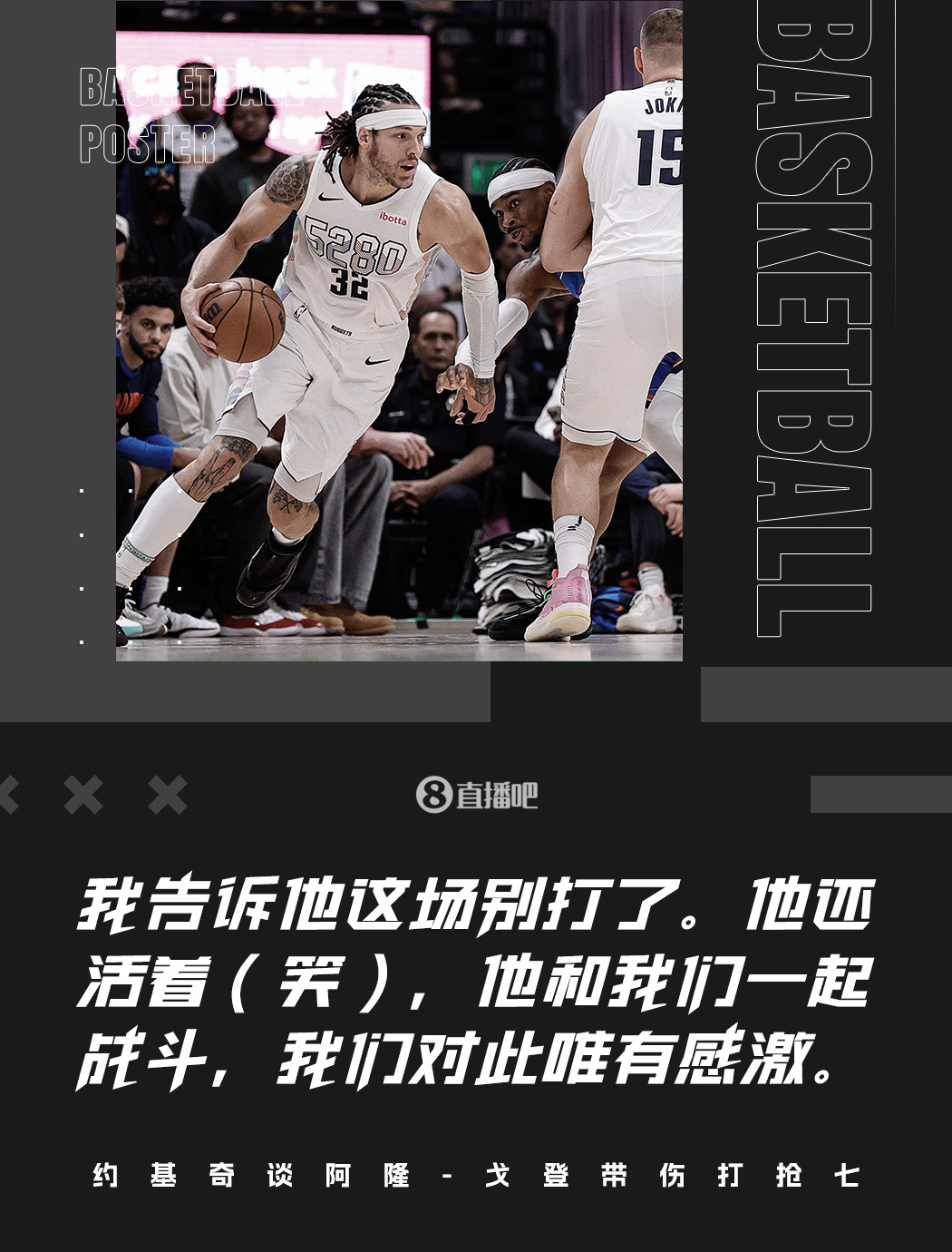 赛后约基奇接受采访,谈到带着二级腿筋拉伤上场的戈登,他说:“我告诉过他不要上场,你可以看到他在场上有点挣扎,移动起来很困难。他还活着(笑),他上场和我们一起战斗,我们对此只有感激。”