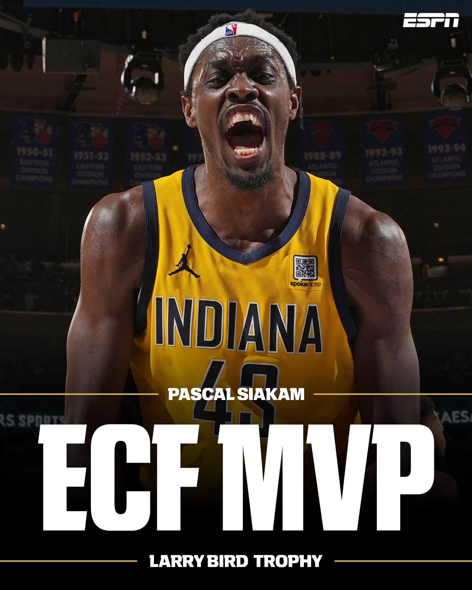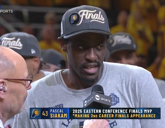 步行者夺得东部冠军后,步行者前锋帕斯卡尔-西亚卡姆荣获拉里-伯德杯(东部决赛MVP)!