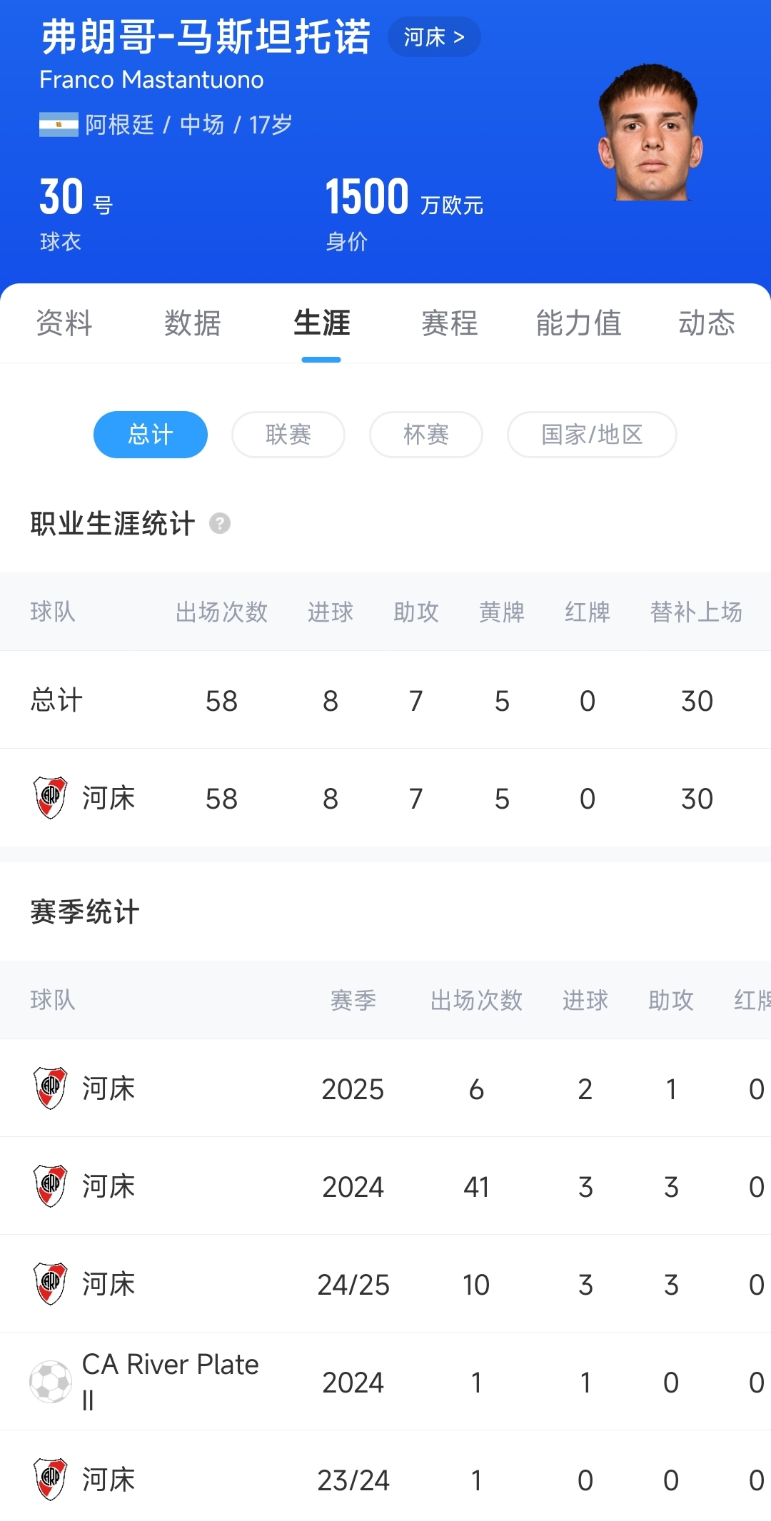 17岁的马斯坦托诺司职进攻型中场,目前身价1500万欧元,他与河床的合同将在2026年12月到期,马斯坦托诺已经代表阿根廷U20国家队出场过10次,打入2粒进球。