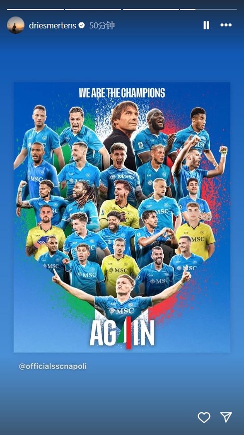 5月24日讯 不久前,那不勒斯名宿默滕斯转发了那不勒斯的夺冠海报。