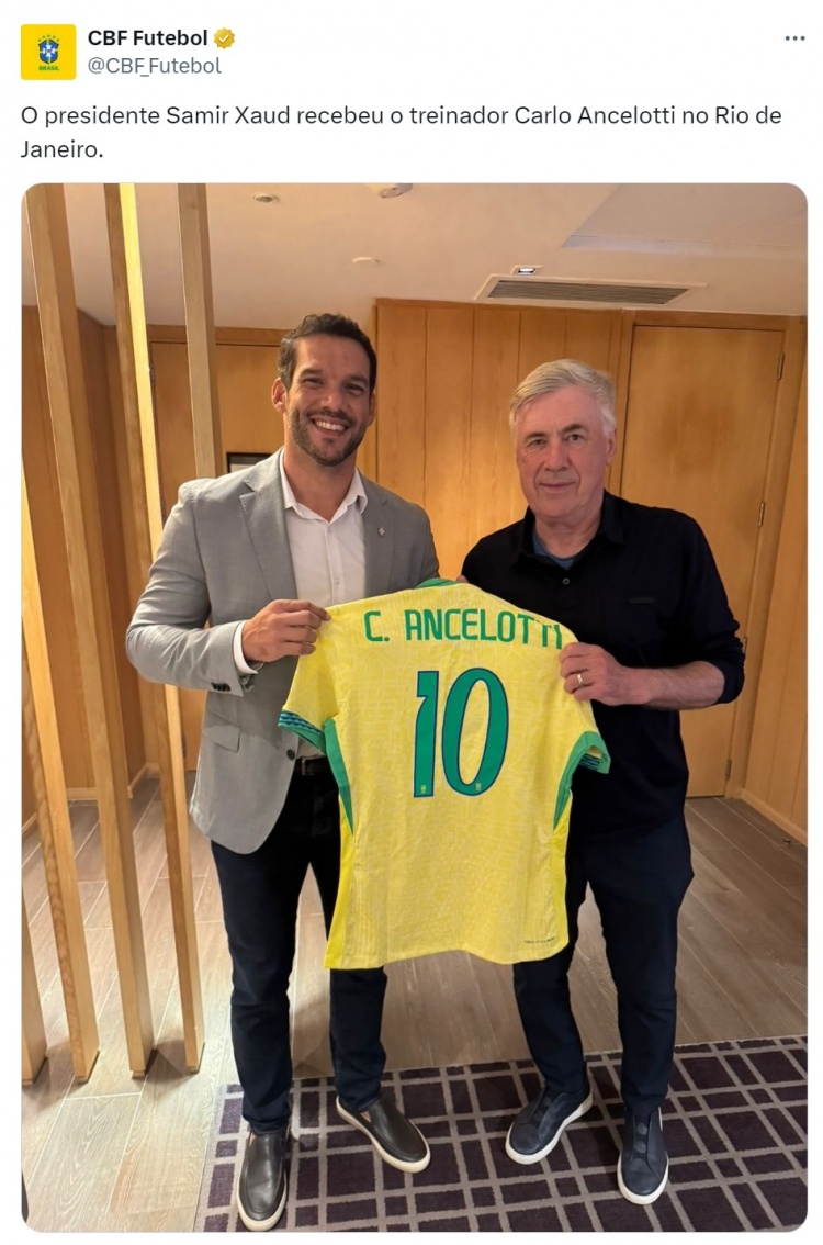 5月26日讯 巴西足协官方社媒更新动态,晒出足协主席萨乌德与安切洛蒂的合照。